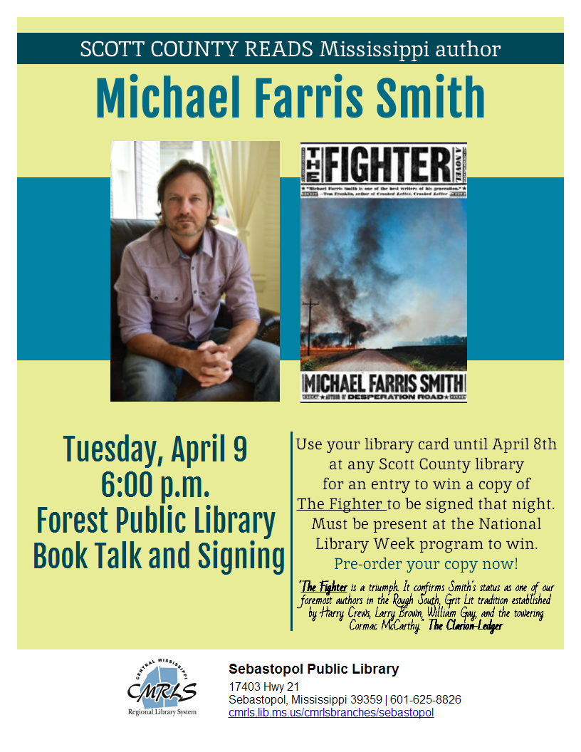 Sebastopol Public Library will be closing early Tuesday, April 9, at 5:00 p.m. for the Scott County Reads book talk and signing taking place at the Forest Public Library. Everyone is invited to join us as we have a book talk and signing with Michael Farris Smith Tuesday, April 9, at 6:00 p.m. Come into any of the Scott County Libraries, Forest, Lake, Morton, or Sebastopol, by the end of Monday, April 8, to enter a chance to win a signed copy of "The Fighter", winners will be announced the evening of the event and you must be present to win.